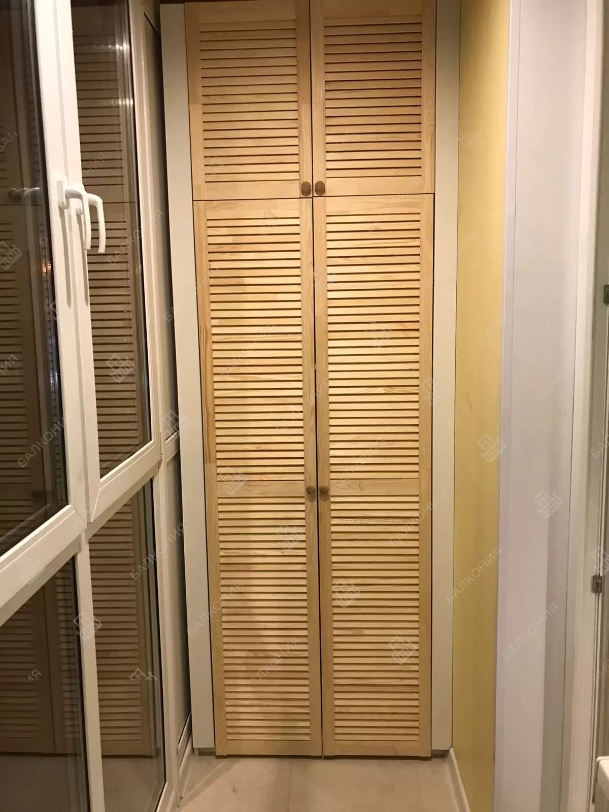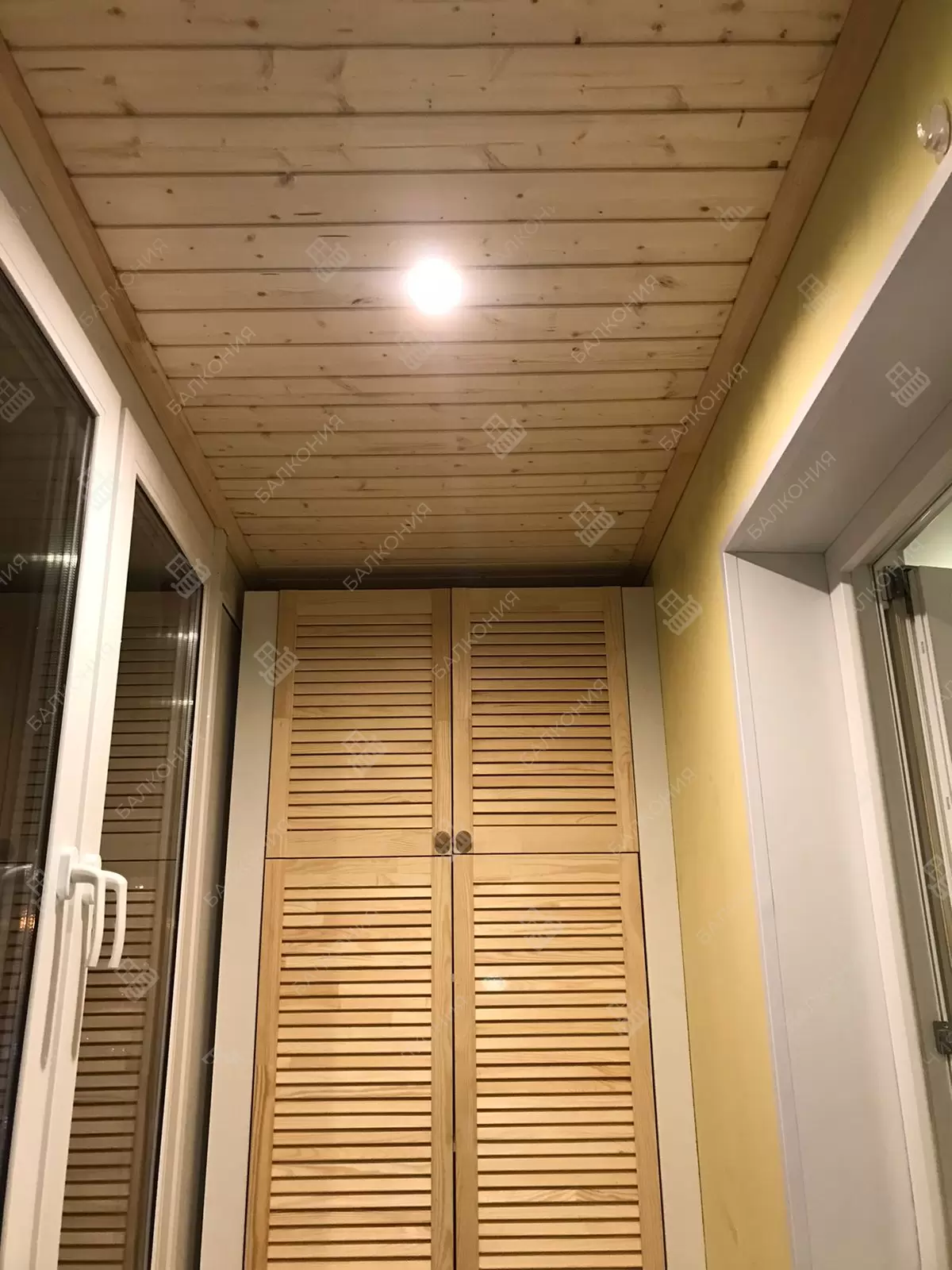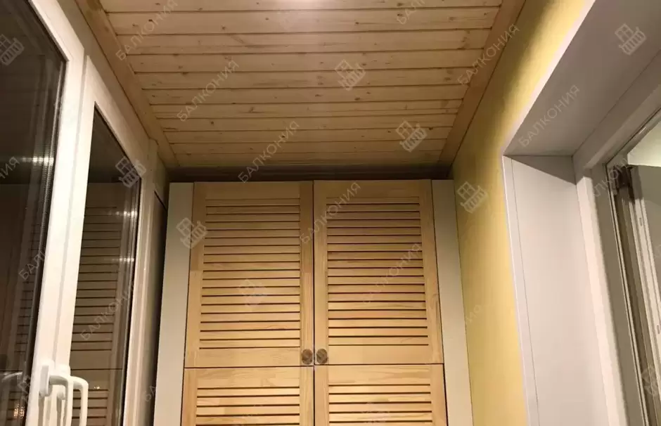 В данном объекте выполнено решение по отделке дополнительного помещения на балконе. Отделка стен и потолка выполнена деревянной вагонкой. Установлена настенная вешалка для велосипеда. Установлен встроеваемый деревянный шкаф. Выведено и разведено по балкону электричество.