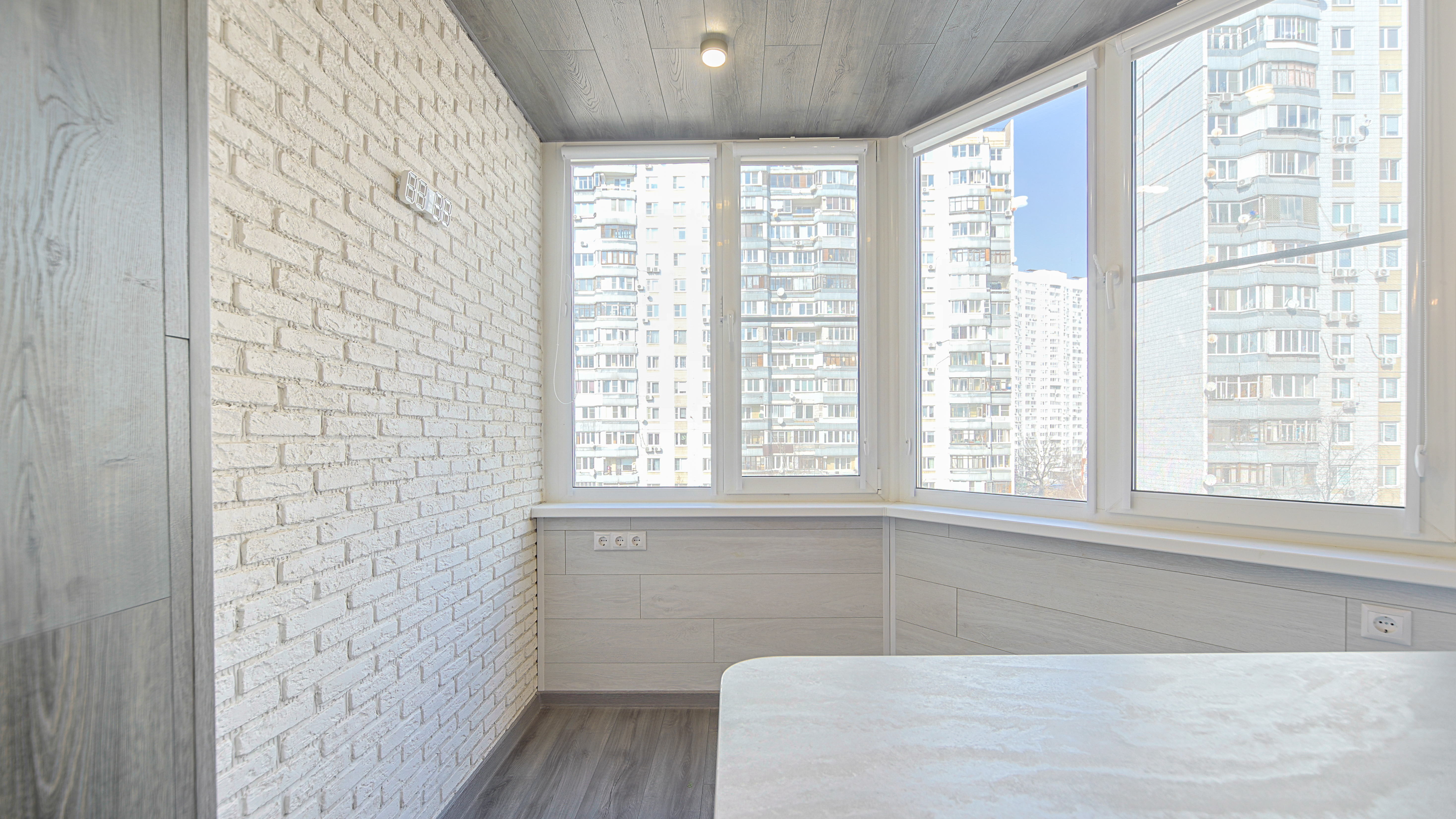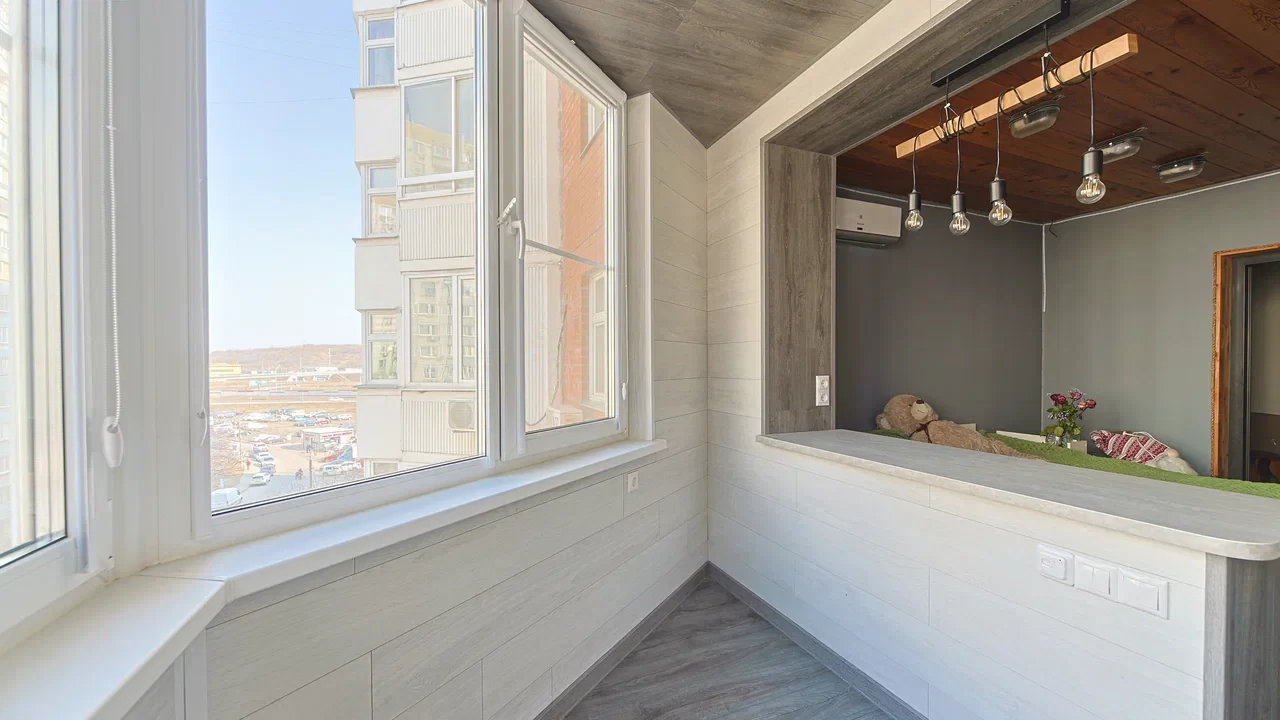 Функциональность: Выполнена столешница в месте объединения лоджии с комнатой, установлены подвесные светильники.