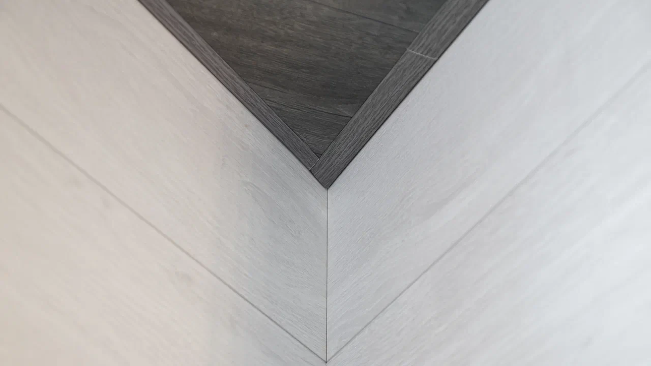 Уникальный дизайн: Влагостойкий ламинат 33 класса (стены, пол, потолок) с контрастными оттенками, искусственный камень на одной стене для придания оригинальности.